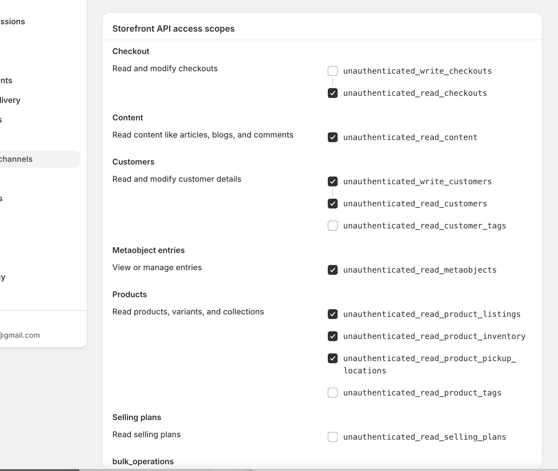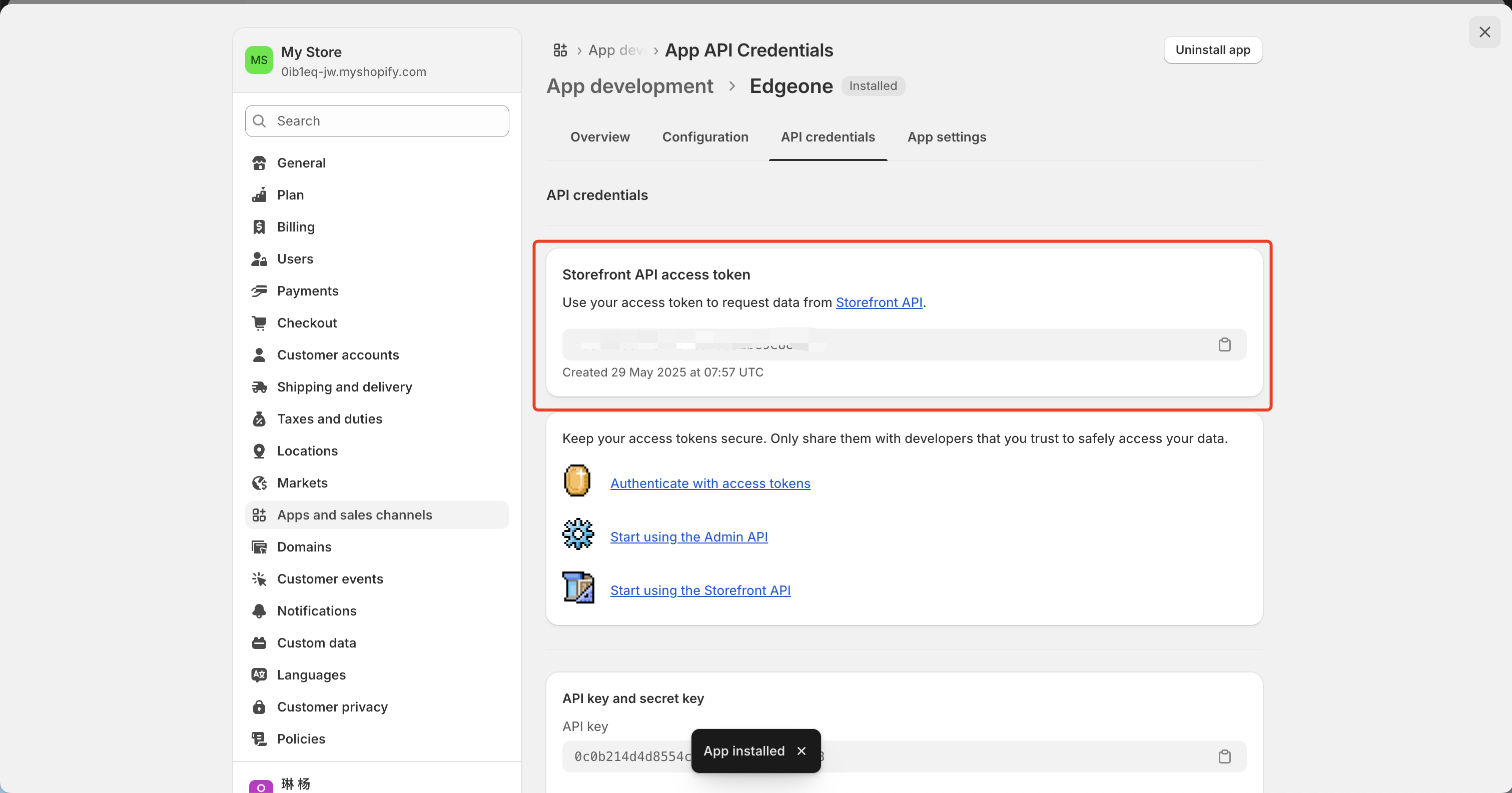 Storefront API Access Token, then you can use API calls to access the Shopify store API.