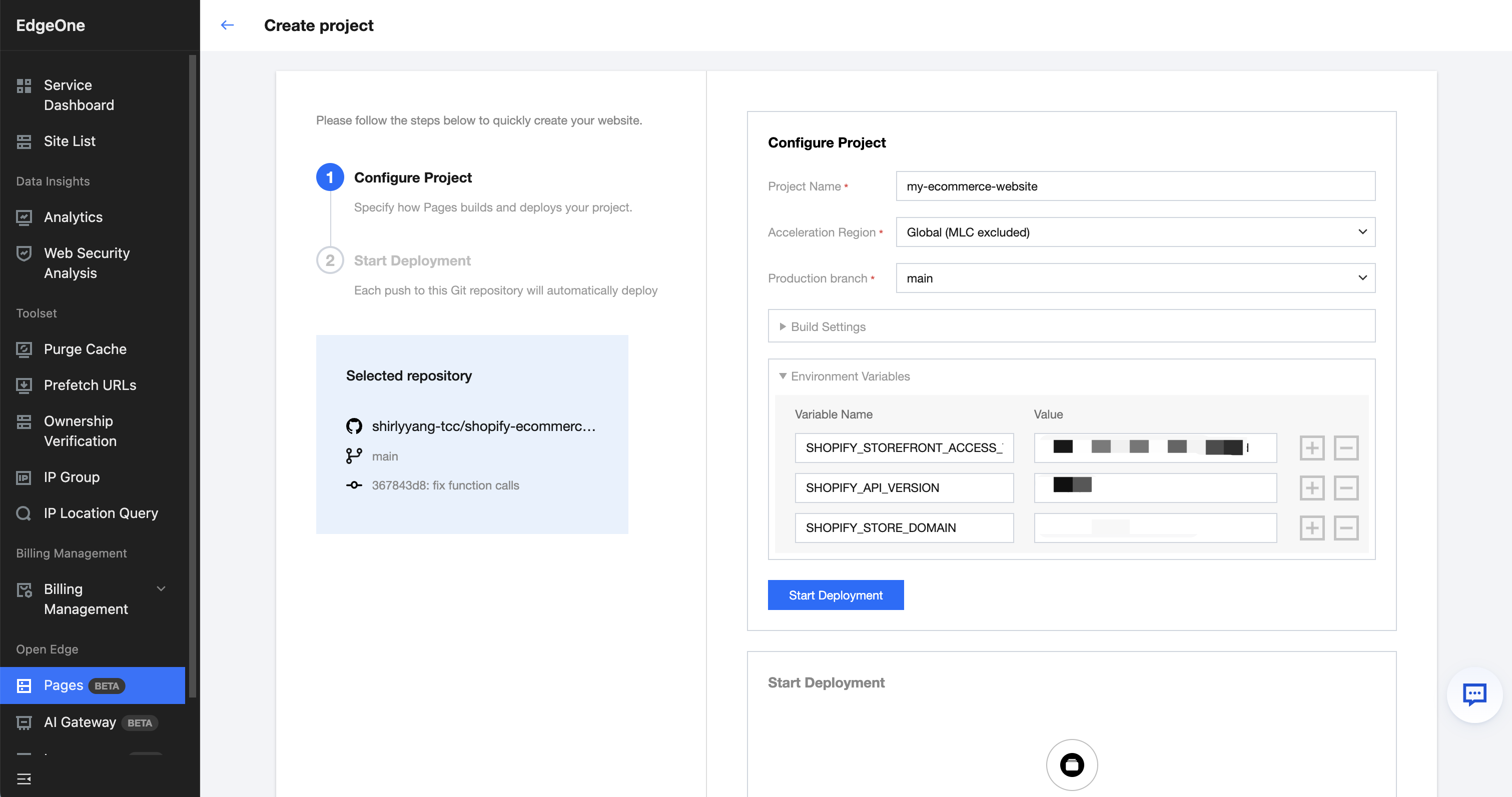 Deploy, and after logging in, enter the console deployment page to configure the following environment variables:SHOPIFY_STORE_DOMAIN: Fill in your Shopify store address.SHOPIFY_STOREFRONT_ACCESS_TOKEN: Fill in your Storefront API Access Token.SHOPIFY_API_VERSION: Fill in 2025-04 if no special requirement.