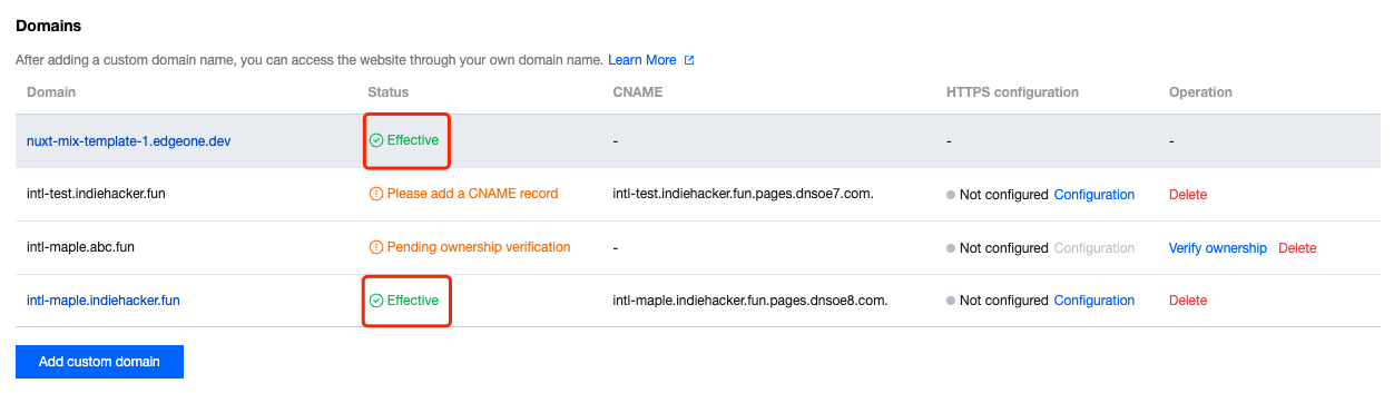 A CNAME record is used to point a domain name to another domain name, commonly used for CDN acceleration or corporate email settings. After you add a custom domain to the Pages Project, you need to configure the appropriate CNAME record at the domain name registrar to access the Pages Project via the domain name.