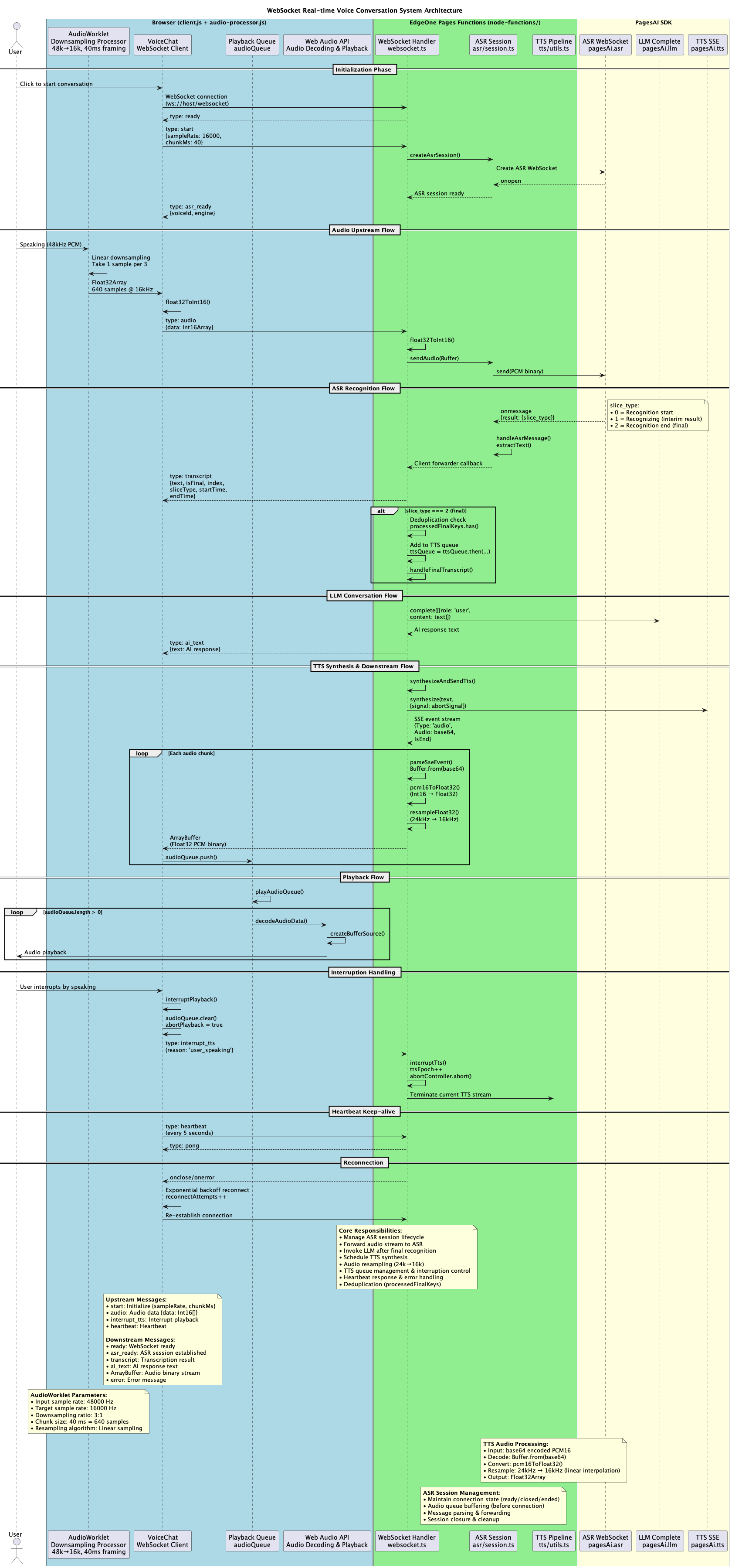 start/audio/interrupt/interrupt_tts/heartbeatrequests,ready/asr_ready/transcript/ai_textand binary audio responses. - PagesAI pipeline: ASR WebSocket for real-time transcription; stable text is chained with PagesAI TTS, server resamples to client sample rate before downstream transmission.